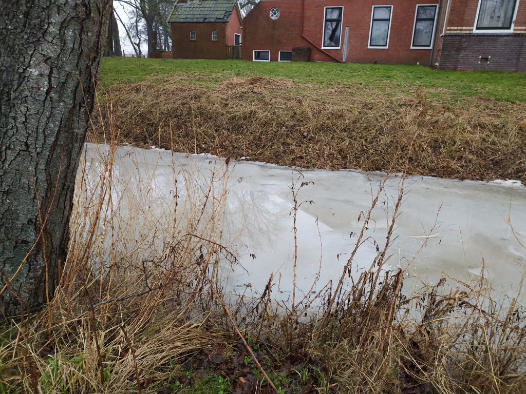Afgelopen weekend lag het er nog zo mooi bij. De ijsvereniging had priksleeën op de agenda gezet. Het had zo mooi kunnen zijn. Op dit moment ligt de gracht van Klaas en Gea, de Ol’nzielster ijsbaan, erbij als een tranendal, en zelfs een waterballet is niet meer mogelijk: Het Ol’nzielster Verdriet:
